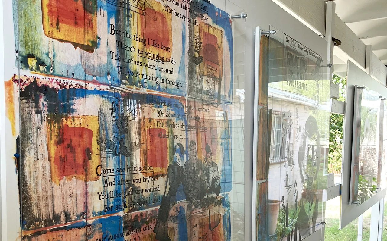 I boarded up our open air porch to make an outdoor gallery. Two pieces of drywall, a dozen 2 x 4’s and a half a gallon of paint and done. Beautiful and very temporary. Perfect for displaying four 36-inch square assemblages. The work was originally featured in the Tempe Center for the Arts Artology exhibition in Tempe Arizona from June 7th through September 23rd, 2025.