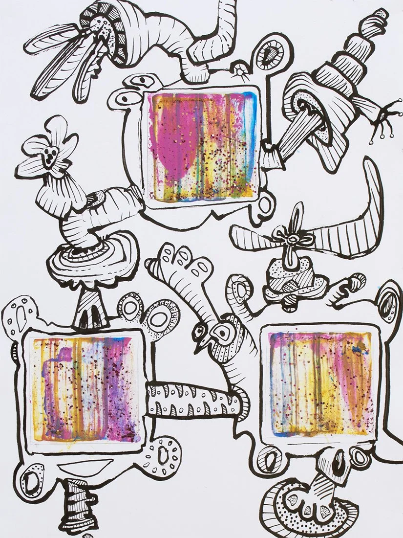 “Sun Gatherers”, 9 x 12 inches, sumi ink, acrylic paint, glitter on paper, 2022